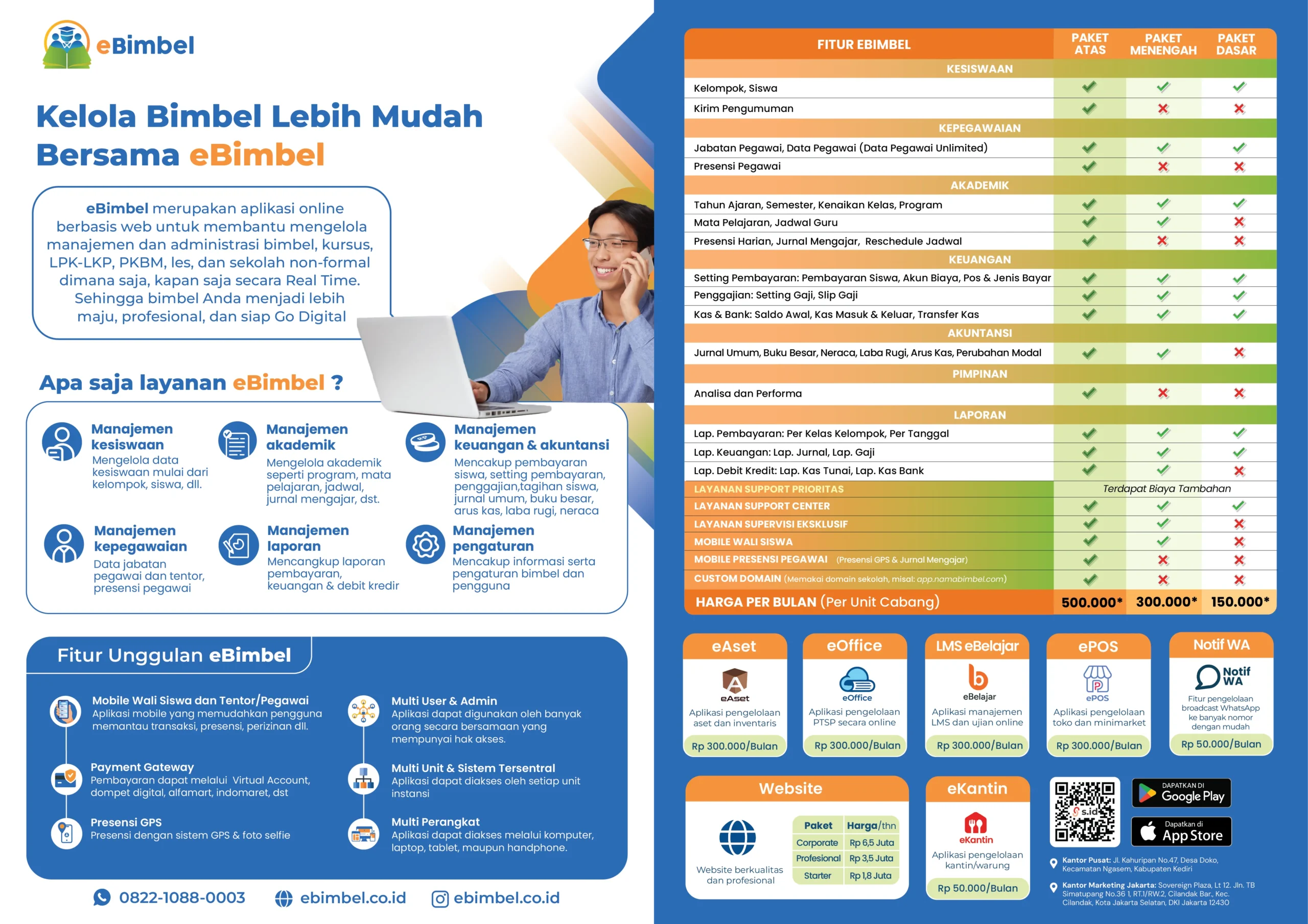 Branding Bimbel, Multi user, Pembayaran Online, Presensi Pegawai GPS, Presensi Siswa per Mata Pelajaran, Android System.